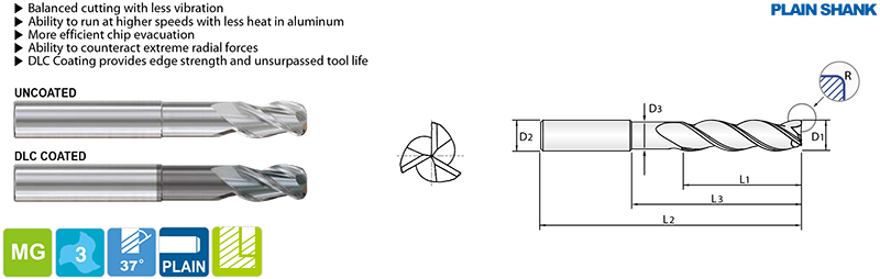 ALU-POWER HPC 3-FLUTE CORNER RADIUS with EXTENDED NECK (PLAIN SHANK) - METRIC (E5H25, JAH25)