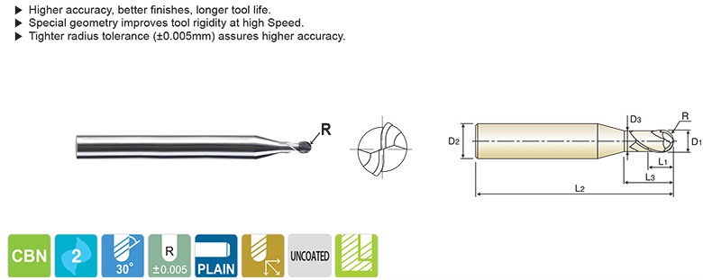 CBN 2 FLUTE 30 DEGREE HELIX BALL END MILL