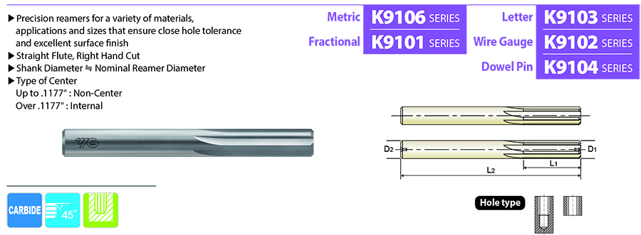 Carbide, Straight Shank Chucking REAMERS - Straight Flute - K9101, K9102, K9103, K9104, K9106